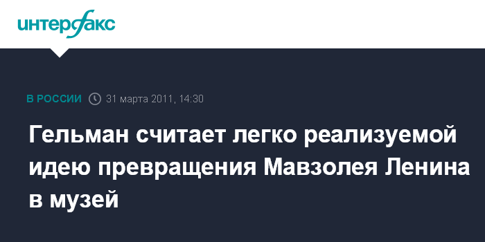Москва. 31 марта. INTERFAX.RU - Член Общественной палаты РФ, известный галерист Марат Гельман считает реальным превращение Мавзолея Ленина в музей.