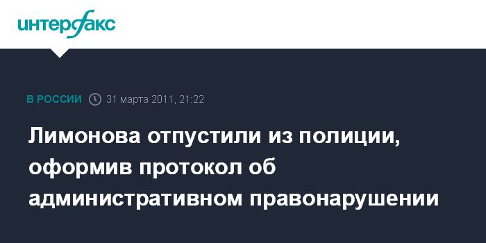 По его словам, в отношении Лимонова составлен протокол об административном правонарушении по статье 20.2 Кодекса об административных правонарушениях. По этой статье Лимонову грозит как минимум штраф, максимальное наказание - 15 суток ареста в изоляторе.