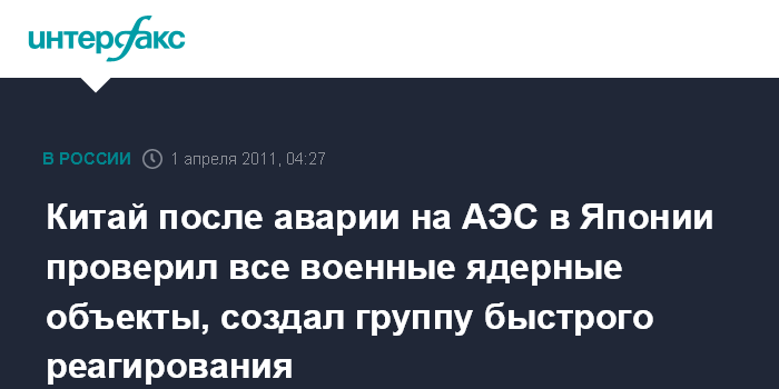Пекин. 1 апреля. ИНТЕРФАКС-КИТАЙ - После вызванной землетрясением аварии на японской АЭС "Фукусима-1" в Китае были подвергнуты серьезной проверке на предмет безопасности все военные ядерные объекты, заявил замначальника отдела стратегического планирования генштаба китайской армии Цай Хуайле.