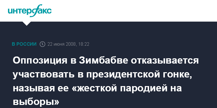 Лондон. 22 июня. ИНТЕРФАКС - Лидер зимбабвийской оппозиции Морган Цвангираи отказался от участия в президентских выборах, которые должны состояться 27 июня.