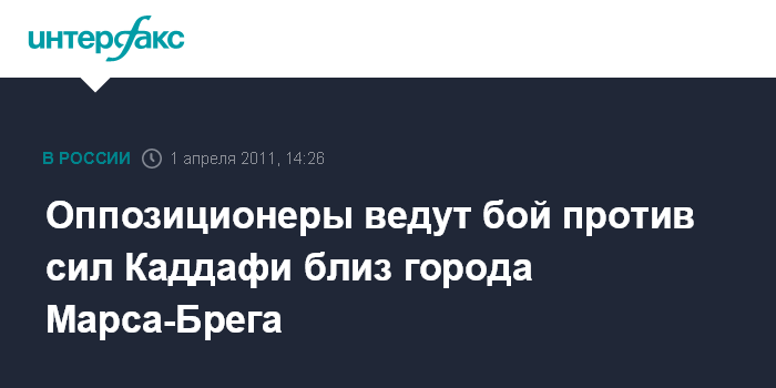 Каир. 1 апреля. INTERFAX.RU - Силы ливийской оппозиции ведут бой с верными Муамару Каддафи военными недалеко от города Марса-Брега, на востоке Ливии, передает в пятницу агентство ЭФЭ.