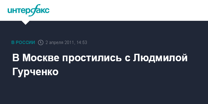 Москва. 2 апреля. INTERFAX.RU - Церемония прощания с выдающейся актрисы театра и кино Людмилы Гурченко завершилась в Центральном доме литераторов в Москве, передает корреспондент "Интерфакса". Несколько тысяч человек провожали гроб с телом у здания ЦДЛ аплодисментами и криками "Браво!". Усыпанный цветами катафалк с телом Л.Гурченко направился на Новодевичье кладбище, где будет похоронена актриса.
