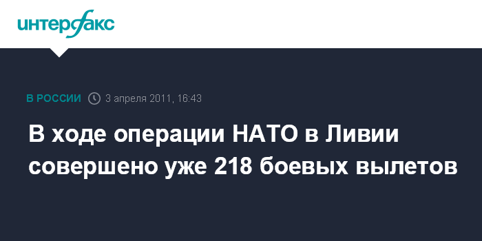 Брюссель. 3 апреля. INTERFAX.RU - С момента перехода военных операций в Ливии под ответственность НАТО, 31 марта, число вылетов союзнической авиации достигло 547, сообщает в воскресенье штаб-квартира альянса в Брюсселе. В частности, совершено 218 боевых вылетов с применением оружия, говорится в сообщении со ссылкой на военное на командование. 2 апреля было осуществлено 184 вылета, в том числе 70 боевых, отмечают в НАТО.