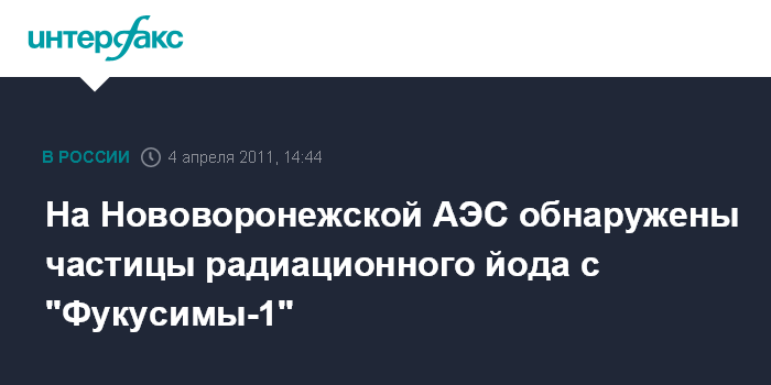 Воронеж. 4 апреля. INTERFAX.RU - Датчики Нововоронежской АЭС уловили частицы радиоактивного йода-131 с японской станции "Фукусима-1", сообщил "Интерфаксу" в понедельник руководитель службы информации АЭС Валерий Кузнецов.
