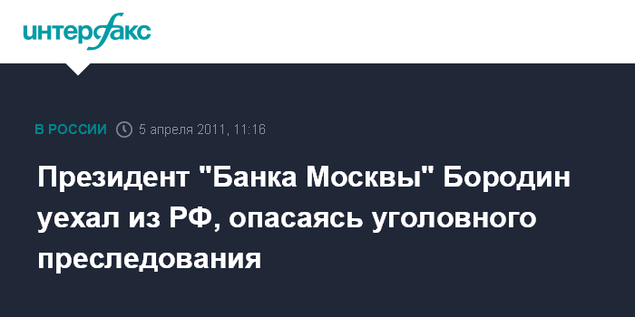 Москва. 5 апреля. INTERFAX.RU - Президент "Банка Москвы" Андрей Бородин покинул Россию, это решение связано с расследованием уголовного дела о мошенничестве с крупным кредитом, сообщил "Интерфаксу" источник знакомый с ситуацией.