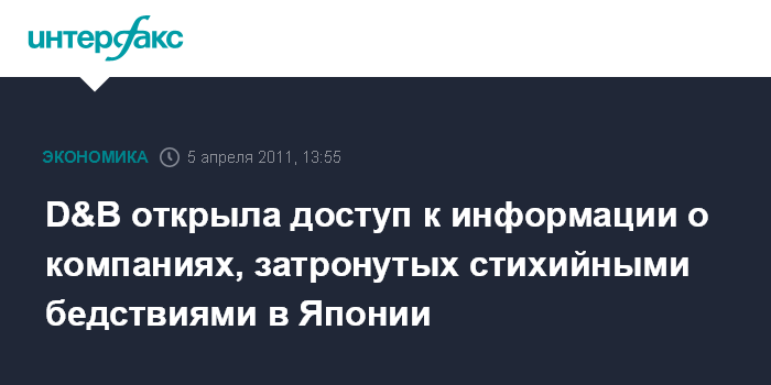 Москва. 5 апреля. INTERFAX.RU - Компания Dun&Bradstreet, занимающаяся бизнес отчетами, открыла бесплатный доступ к базе компаний, потенциально затронутых стихийным бедствием в Японии.