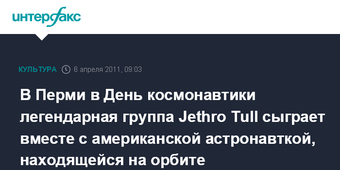 Пермь. 6 апреля. INTERFAX.RU - В День космонавтики, 12 апреля, состоится премьера музыкального мирового дебюта американской астронавтки, находящейся на орбите, и легендарной группы Jethro Tull, которая в это время будет на концерте в Перми.