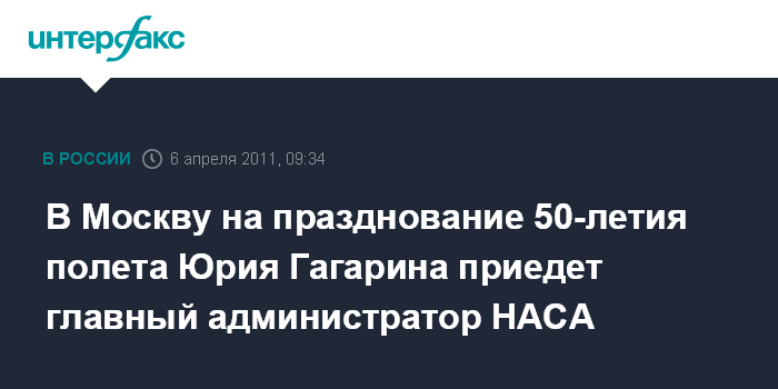 В Москву на празднование 50-летия полета Юрия Гагарина приедет главный администратор НАСА