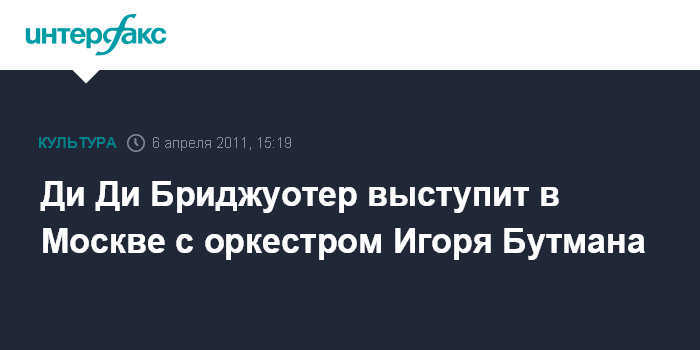 Москва. 6 апреля. INTERFAX.RU - Известная джазовая вокалистка Ди Ди Бриджуотер на концерте 8 апреля в Московском международном Доме музыки представит новую программу, подготовленную совместно с оркестром Игоря Бутмана.
