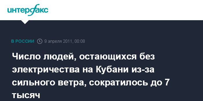 Краснодар. 9 апреля. ИНТЕРФАКС-ЮГ - Энергетики продолжают восстанавливать электроснабжение, нарушенное в ряде районов Краснодарского края из-за сильного ветра в пятницу, сообщили агентству "Интерфакс - Юг" в пресс-службе ОАО "Кубаньэнерго".