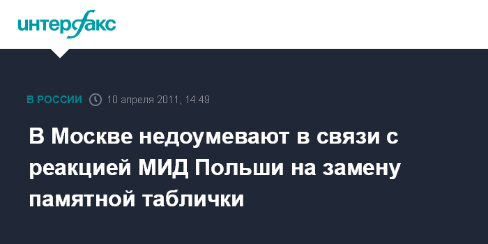 Москва. 10 апреля. INTERFAX.RU - В МИД РФ выражают недоумение в связи с реакцией польской стороны по поводу замены памятной таблички, установленной на месте катастрофы самолета Ту-154 президента Польши Леха Качиньского. "В ходе проведения работ по подготовке посещения места авиакатастрофы главами двух государств российская сторона заблаговременно проинформировала польскую сторону о необходимости замены таблички на новую - на русском и польском языках, как это принято для всех без исключения памятников и памятных знаков на территории Российской Федерации", - говорится в заявлении МИД РФ, распространенном в воскресенье.