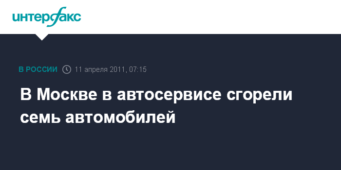 Москва. 11 апреля. ИНТЕРФАКС-МОСКВА - Семь автомобилей сгорели в результате пожара в автосервисе на севере Москвы, сообщил "Интерфаксу" источник в правоохранительных органах.