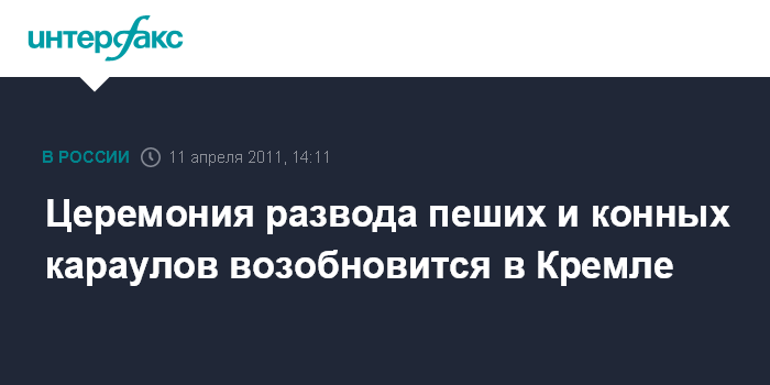 Москва. 11 апреля. INTERFAX.RU - Первая в этом году церемония развода пеших и конных караулов Президентского полка состоится в столичном Кремле в субботу, сообщили в центре по связям с прессой и общественностью ФСО РФ.