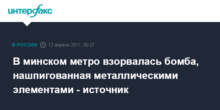 Минск. 11 апреля. INTERFAX.RU - Взрывное устройство, которое было приведено в действие в минском метро, было наполнено металлическими поражающими элементами, заявил агентству "Интерфакс-Запад" источник в правоохранительных органах.