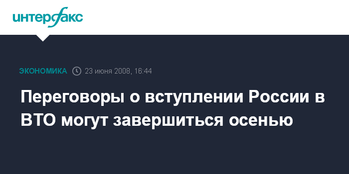 "Общая ситуация на переговорах позволяет рассчитывать на завершение работы по докладу рабочей группы осенью 2008 года", - сказал он. По его словам, новая версия доклада может быть выпущена секретариатом ВТО до конца июля.