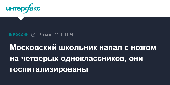 Москва. 12 апреля. INTERFAX.RU - В Москве возбуждено уголовное дело в отношении 16-летнего подростка, который пытался зарезать четверых сверстников.