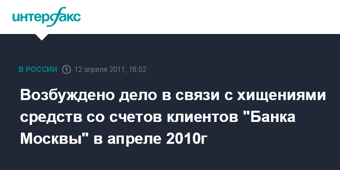 Возбуждено дело в связи с хищениями средств со счетов клиентов "Банка Москвы" в апреле 2010г