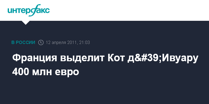 Париж. 12 апреля. INTERFAX.RU - Правительство Франции окажет в ближайшее время финансовую помощь Кот д'Ивуару.