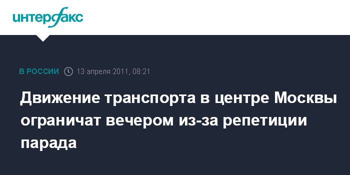 Москва. 13 апреля. INTERFAX.RU - В центре Москвы в среду вечером будет ограничено движение в связи с проведением репетиции парада Победы, сообщили "Интерфаксу" в пресс-службе ГИБДД по столице.