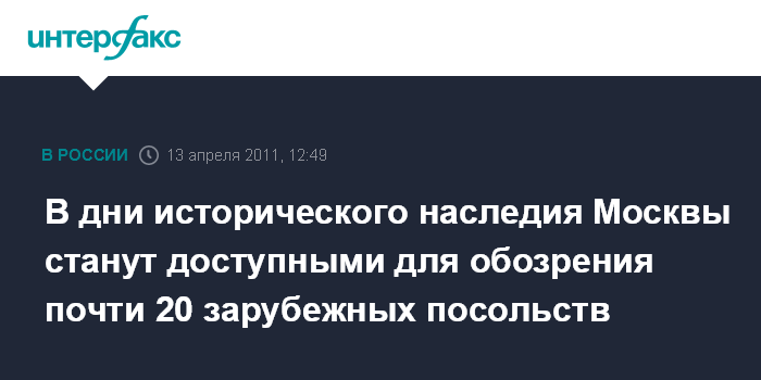 Москва. 13 апреля. INTERFAX.RU - В Дни исторического и культурного наследия Москвы 18 посольств и дипломатических резиденций, расположенных в исторических зданиях, будут открыты для экскурсий, сообщил руководитель департамента культурного наследия столицы Александр Кибовский.