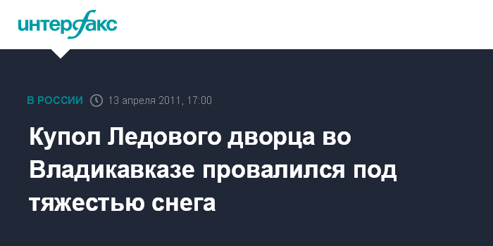 Владикавказ. 13 апреля. INTERFAX.RU - Во Владикавказе (Северная Осетия) в среду в городском ледовом дворце рухнул купол, не выдержав тяжести мокрого снега.