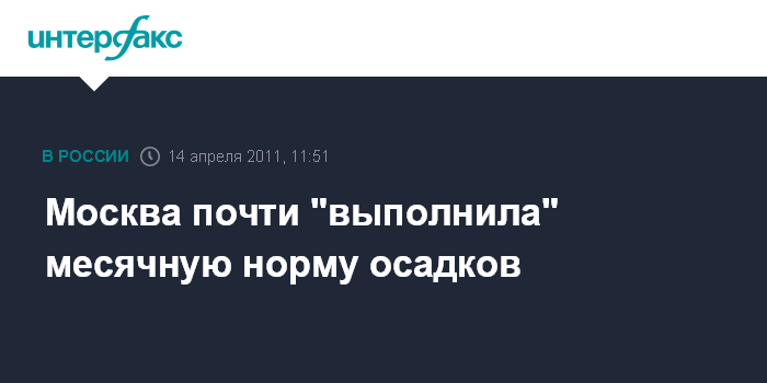 Москва. 14 апреля. INTERFAX.RU - Данные базовой столичной метеостанции, расположенной на ВВЦ, свидетельствуют о том, что Москва близка к выполнению апрельской месячной нормы осадков.