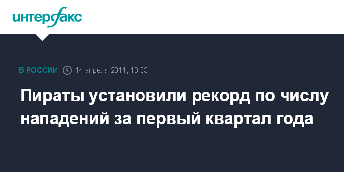 Санкт-Петербург. 14 апреля. INTERFAX.RU - За первый квартал 2011 год число нападений пиратов на гражданские суда достигло рекордной отметки, сообщает сайт Российского профсоюза моряков в четверг со ссылкой на Международное морское бюро (ММБ).