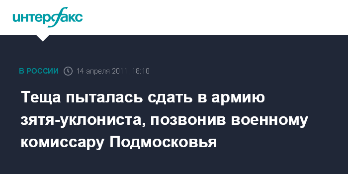 В одном из военкоматов, куда позвонил корреспондент "Интерфакса", на условиях анонимности сообщили, что данный случай не единичный, и что не только тещи, но и родители, порой, выдают своих уклоняющихся от службы детей.