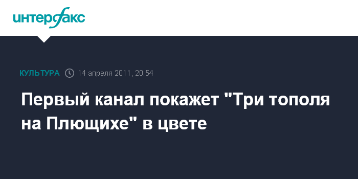 Москва. 14 апреля. INTERFAX.RU – Цветная версия фильма "Три тополя на Плющихе" будет показана на Первом канале на следующих выходных, сообщили "Интерфаксу" в пресс-офисе компании "Формула цвета".
