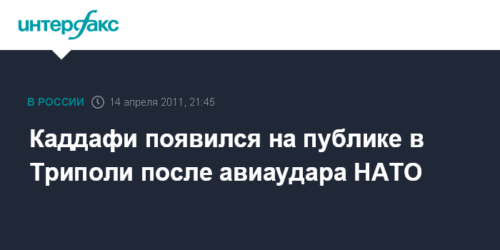 Триполи. 14 апреля. INTERFAX.RU - Ливийский лидер Муамар Каддафи проехал во внедорожнике по улицам столицы страны Триполи после бомбардировок НАТО, сообщает в четверг государственное телевидение Ливии.