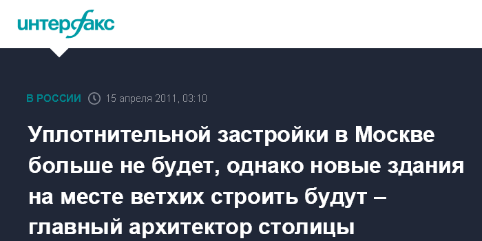 Уплотнительной застройки в Москве больше не будет, однако новые здания на месте ветхих строить будут – главный архитектор столицы