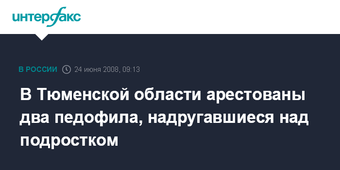 Тюмень. 24 июня. INTERFAX.RU - В Тюменской области арестованы двое насильников, убивших 12-летнюю девочку.