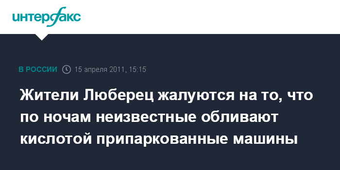 Москва. 15 апреля. INTERFAX.RU – Жители Люберец сообщают, что в некоторых районах города по ночам неизвестные люди обливают кислотой припаркованные во дворах автомобили, в результате чего владельцы обнаруживают утром свои машины со "съеденной краской".