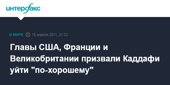 Лондон. 15 апреля. INTERFAX.RU - Президент США Барак Обама, его коллега из Франции Николя Саркози, а также премьер-министр Великобритании Дэвид Кэмерон призвали в совместном коммюнике ливийского лидера Муамара Каддафи подать в отставку, сообщает в пятницу британская газета The Guardian.