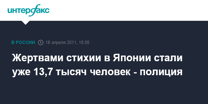 Токио. 16 апреля. INTERFAX.RU - Число жертв разрушительного землетрясения и цунами 11 марта в Японии достигло 13 тыс. 705 человек, сообщает Национальное полицейское агентство в субботу. По данным ведомства, на 18:00 местного времени наибольшее число погибших приходится на префектуры Мияги - 8 тыс. 360 человек, Иватэ - 3 тыс. 952 человек и Фукусима - 1 тыс. 330 человек. На эти же префектуры приходится и максимальное количество пропавших без вести. Так, в печальном списке значатся 14 тыс. 175 человек. Число пострадавших, по последним данным полицейских, достигло 4917 человек.