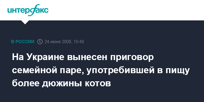Полтава. 24 июня. INTERFAX.RU - Киевский районный суд Полтавы вынес обвинительный приговор семейной паре, которая употребляла в пищу котов, сообщает пресс-служба областного управления милиции в Полтавской области.