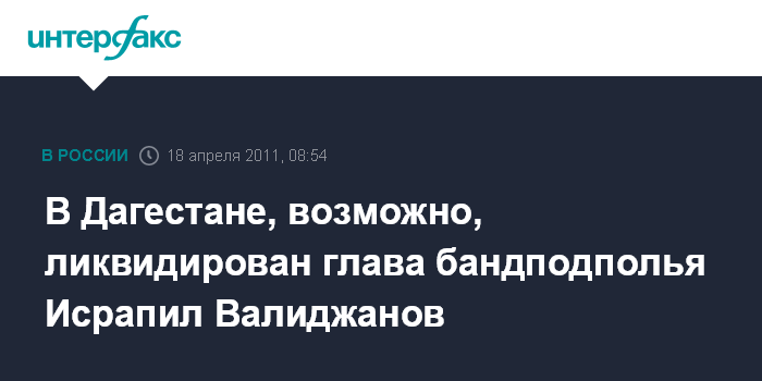 Махачкала. 18 апреля. INTERFAX.RU - Один из четырех убитых в Левашинском районе Дагестана боевиков предварительно опознан как главарь бандподполья Исрапил Валиджанов, сообщил в понедельник "Интерфаксу" источник в правоохранительных органах.