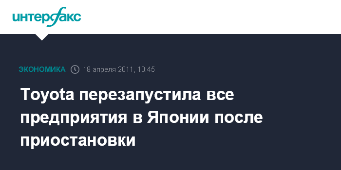 Токио. 18 апреля. INTERFAX.RU - Toyota Motor Corp (TMC) возобновила работу всех предприятий в Японии после приостановки в марте 2011 года из-за стихийного бедствия, сообщает Kyodo News.