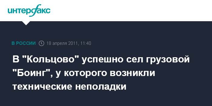 Екатеринбург. 18 апреля. INTERFAX.RU - Грузовой самолет "Боинг" совершил вынужденную посадку в понедельник в аэропорту "Кольцово" (Екатеринбург), сообщил агентству "Интерфакс-Урал" представитель аэропорта.