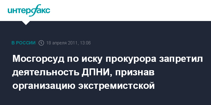 "Московский городской суд в полном объеме удовлетворил заявление прокурора столицы о признании межрегионального общественного движения "Движение против нелегальной иммиграции" (ДПНИ) экстремистским и запрете его деятельности", - говорится в сообщении, размещенном в понедельник на сайте Генпрокуратуры РФ.