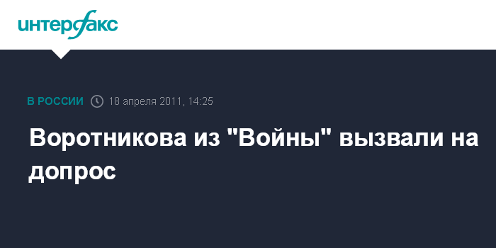 Санкт-Петербург. 18 апреля. INTERFAX.RU - Следователь управления СКР по Петербургу вызвал на допрос одного из лидеров арт-группы "Война" Олега Воротникова, в отношении которого было возбуждено уголовное дело после акции оппозиции 31 марта.