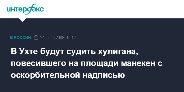 Москва. 24 июня. INTERFAX.RU - Следственный отдел СК при прокуратуре РФ по Ухте возбудил уголовное дело по ч.1 ст.282 УК РФ ("возбуждение ненависти либо вражды, а равно унижение человеческого достоинства") в отношении хулигана, повесившего на площади в Ухте оскорбительный манекен, сообщили "Интерфаксу" в следственном управлении СК при прокуратуре РФ по Коми.