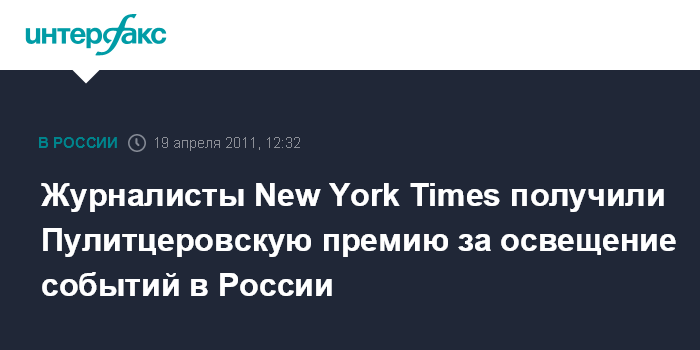 Вашингтон. 19 апреля. INTERFAX.RU - Сотрудники американской газеты New York Times Клиффод Леви и Эллен Барри стали лауреатами Пулитцеровской премии за статьи о России.