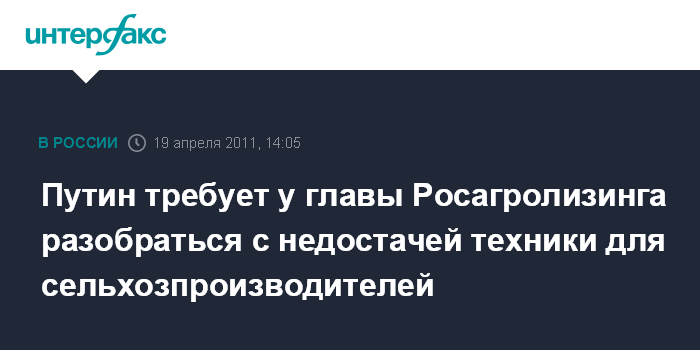 Ново-Огарево. 19 апреля. INTERFAX.RU - Премьер-министр РФ Владимир Путин потребовал разобраться, куда пропала часть техники, предназначенной сельхозпроизводителям в лизинг с 50-процентной скидкой.