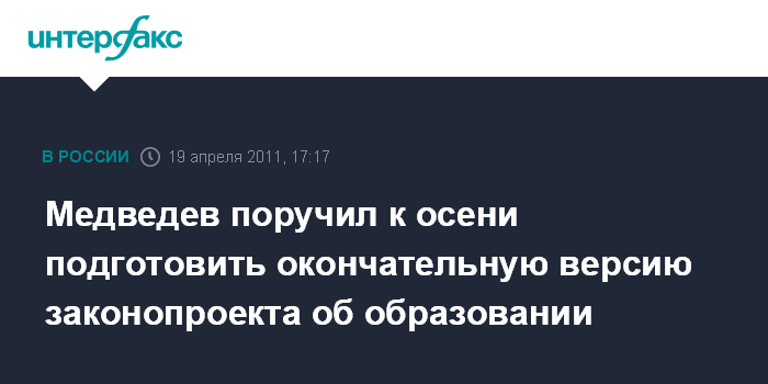 Горки. 19 апреля. INTERFAX.RU - Окончательный вариант нового закона об образовании должен быть готов к осени, заявил президент РФ Дмитрий Медведев на встрече с главой Минобрнауки Андреем Фурсенко.