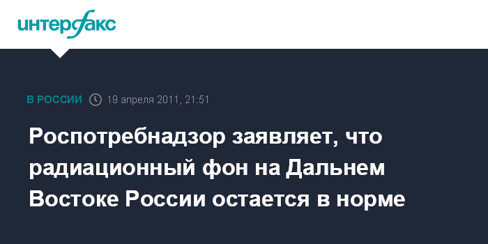 Москва. 19 апреля. INTERFAX.RU - На Дальнем Востоке уровень радиации не превышает характерных значений, сообщил во вторник Роспотребнадзор.