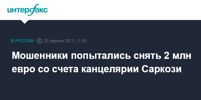 Париж. 20 апреля. INTERFAX.RU - Группа французских мошенников совершила неудачную попытку снять 2 млн евро с банковского счета Елисейского дворца, сообщает в среду парижская пресса.