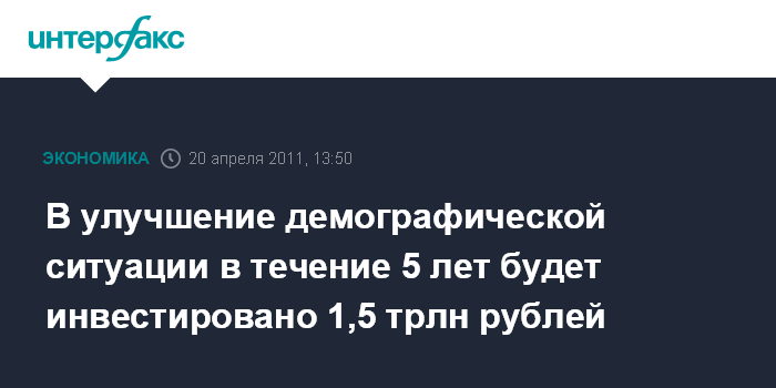 "Мы приступили к реализации второго этапа концепции демографической политики, рассчитанного на 2011-2015 годы. По нашим предварительным расчетам, в демографические проекты за это время будет вложено порядка 1,5 трлн рублей", - сказал Путин, выступая в Госдуме РФ в среду.