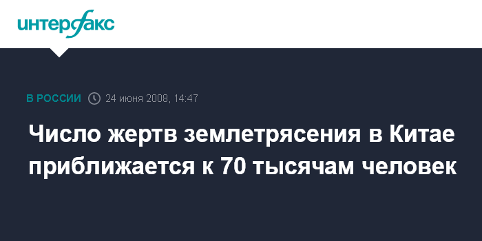 Москва. 24 июня. INTERFAX.RU - Число погибших в результате разрушительного землетрясения на юго-западе Китае достигло 69 тысяч 185 человек, говорится в сообщении, размещенном во вторник на открытом сайте агентства "Синьхуа" со ссылкой на данные пресс-канцелярии Госсовета КНР.