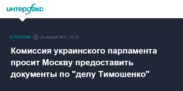 Киев. 20 апреля. INTERFAX.RU - Временная следственная комиссия Верховной Рады намерена просить у российской стороны документы, касающиеся уголовного дела в отношении экс-премьера Украины Юлии Тимошенко, которое было возбуждено в России.